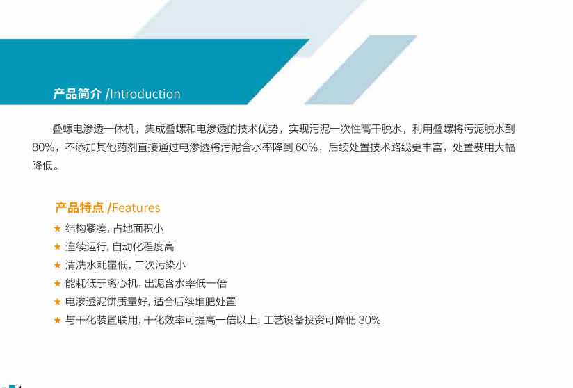 电洛电渗透一体机,集成叠螺和电渗透的技术优势,实现污泥一次性高干脱水,利用叠螺将污泥脱水到80%,不添加其他药剂直接通过电渗透将污泥含水率降到60%,后续处置技术路线更丰富,处置费用大幅降低。