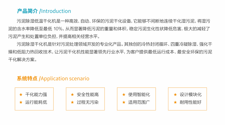 污泥除湿低温干化机是一种高效、自动、环保的污泥干化设备,它能够不间断地连续干化湿污泥,将湿污泥的含水率降低至最低10%,从而显著降低污泥的重量和体积,稳定污泥生化形状降低文海,极大的减低了污泥产生和处置单位负担,并提高相关经营水平。